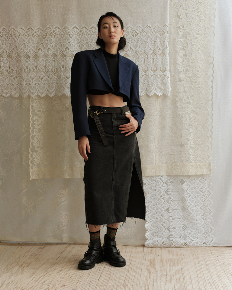 This one-of-one denim skirt is crafted from upcycled vintage denim, featuring a bold front slit and raw frayed edges that give it an effortlessly worn-in feel. The light acid wash and fitted silhouette add a touch of character, making it an easy standout for everyday dressing.