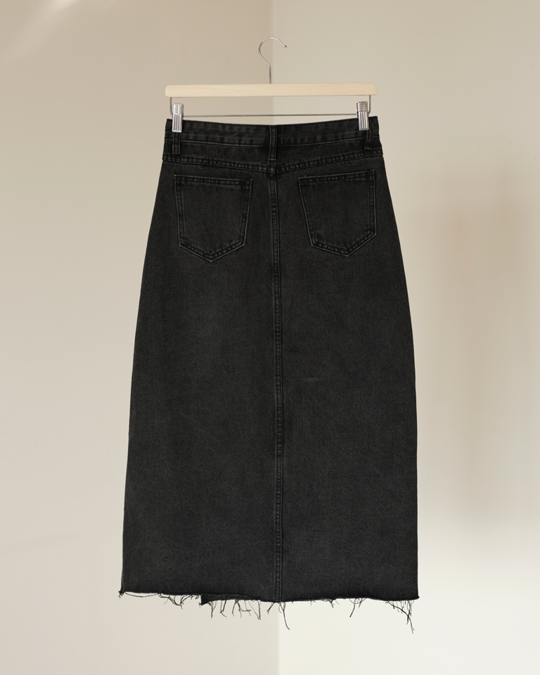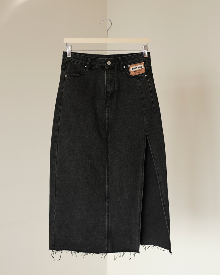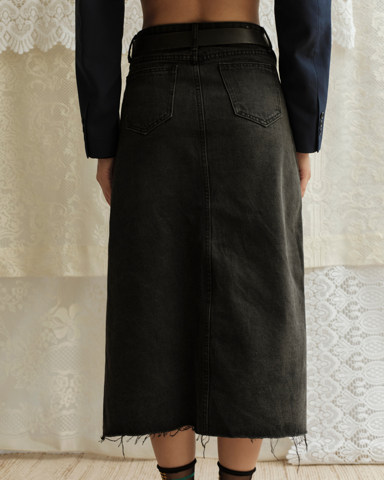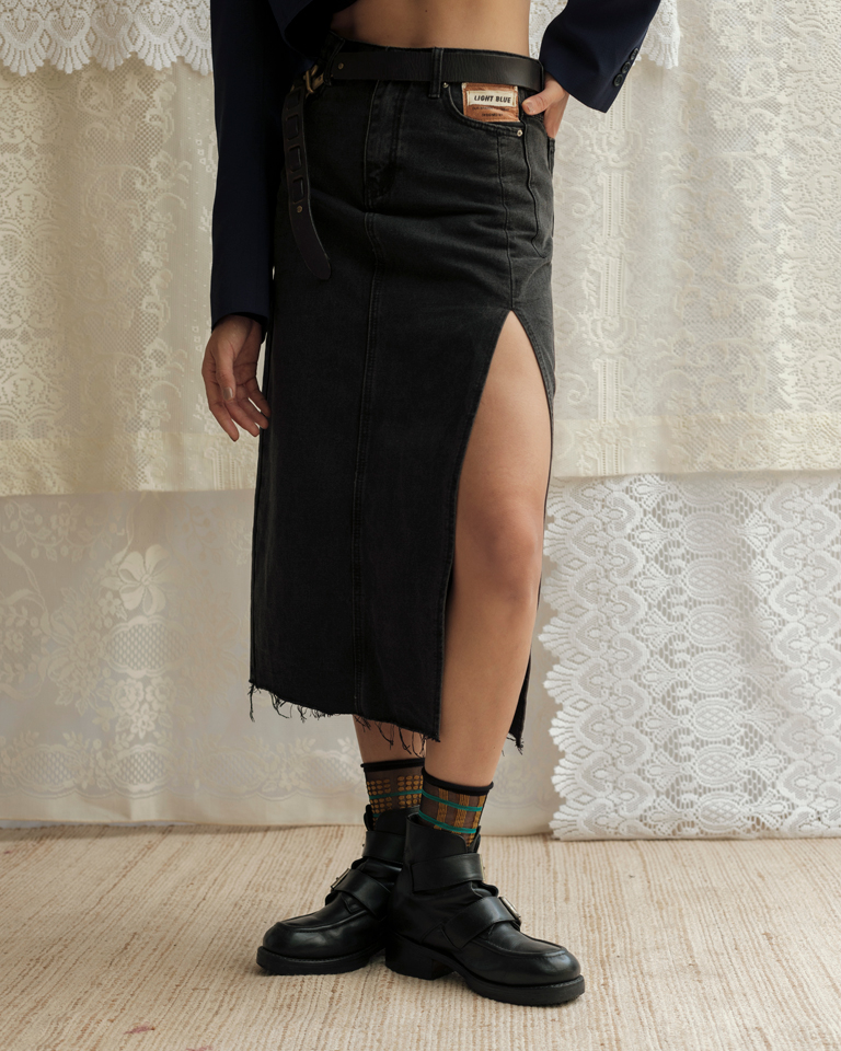 Frayed and faded — this high-slit denim skirt brings vintage edge to everyday wear.