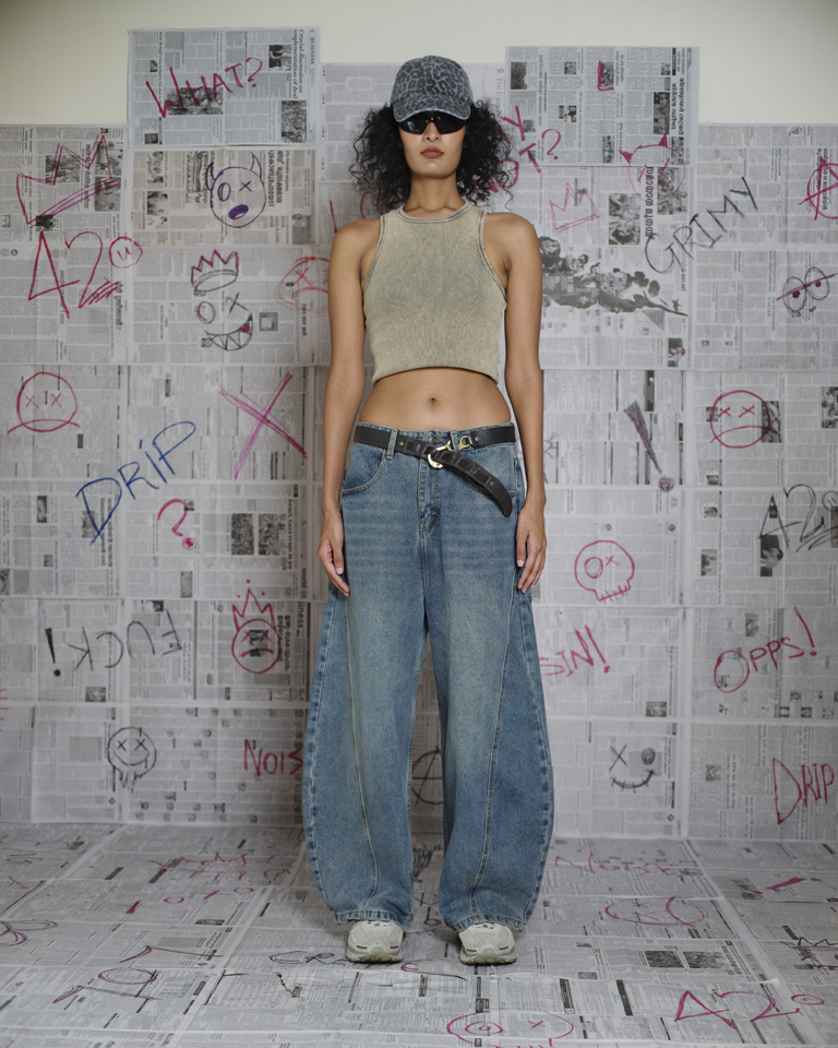 This bubble denim jeans is all about volume, attitude, and 90s nostalgia. Built with a curved wide-leg silhouette and relaxed fit, it brings a sculptural shape that stands out effortlessly.