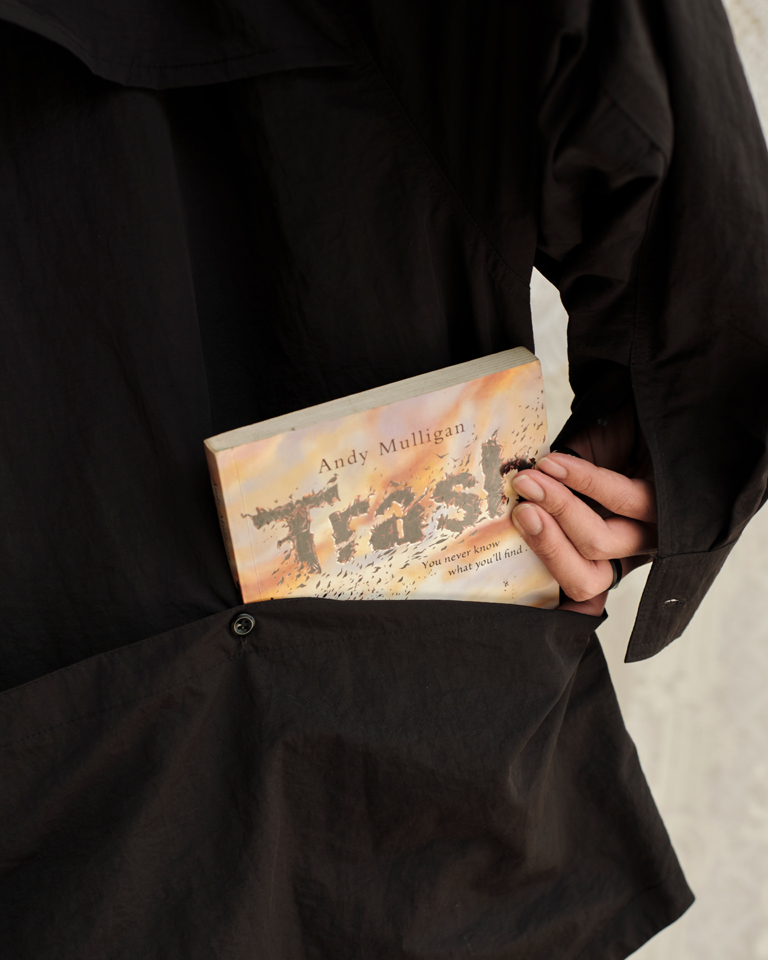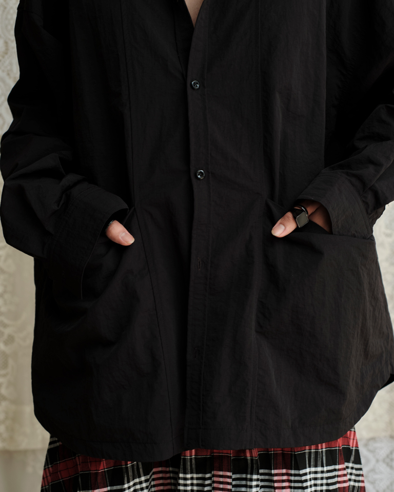 This one-of-a-kind oversized shacket blends utility with personality. Designed in a textured technical fabric, it features thoughtful details — including a functional book-sized pocket. Whether you’re layering up or styling it solo, it’s a standout piece made for exploration, comfort, and storytelling.