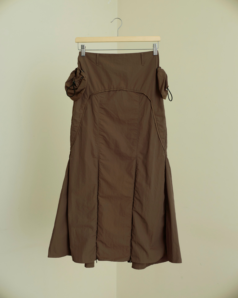 A structured brown midi skirt designed with utility-inspired detailing. Featuring detachable side pockets and zipper accents, the panelled silhouette offers movement while maintaining a clean contemporary shape.