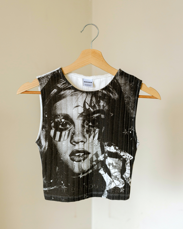 A fitted ribbed top with bold edge, featuring a striking graphic that demands attention. Pair it with distressed denim, leather, or low-rise cargos.