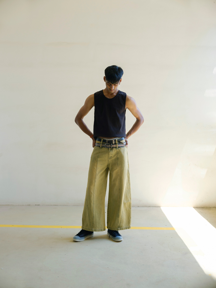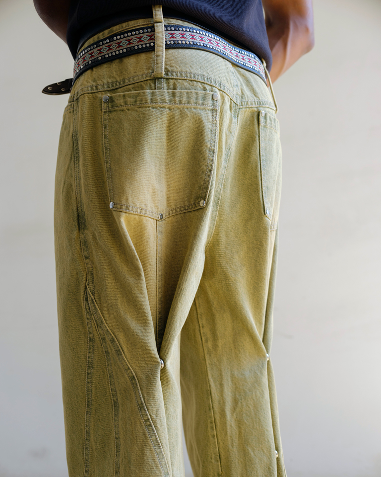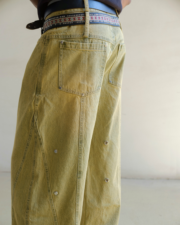 Crafted in a unique sand-blasted green wash, this denim redefines minimal with a twist. Clean at first glance, it reveals back snap details and two belt loops for styling versatility. Whether worn casual or styled bold, this piece is built for self-expression.
