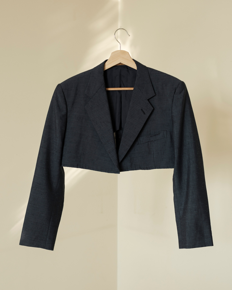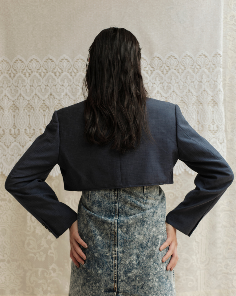 A tailored navy cropped blazer that blends classic structure with a bold, modern edge.