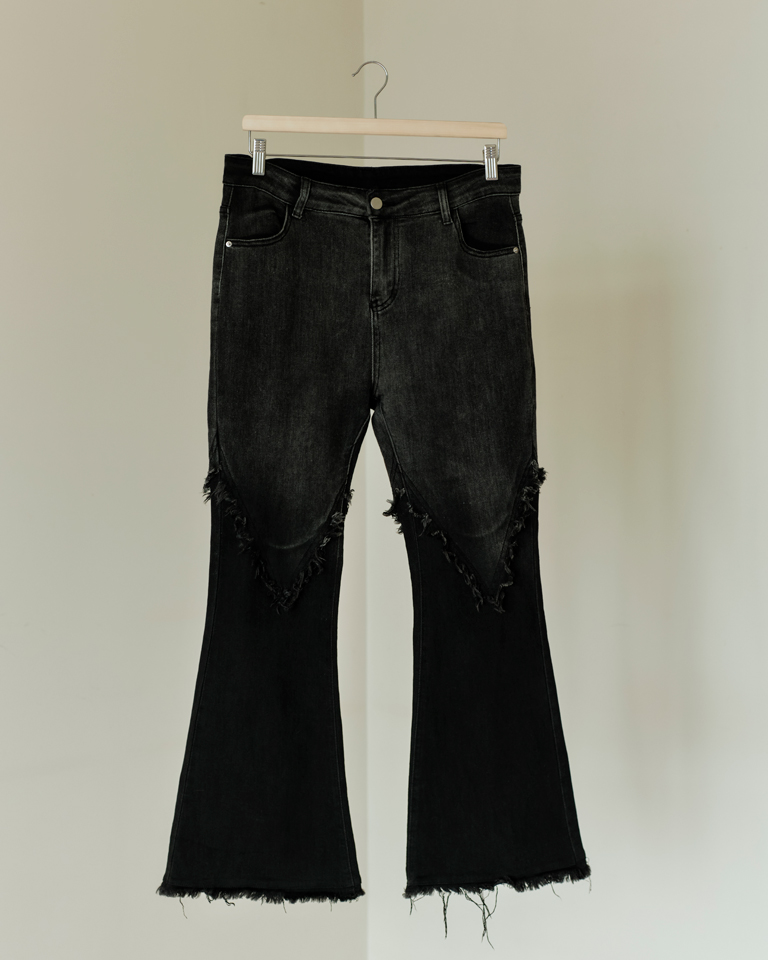 We upcycled old denim into bold bellbottom jeans with dramatic flares and raw frayed hems. The high-rise waist flatters your shape, while the wide-leg silhouette adds vintage attitude with a rebellious twist. As you walk, the exaggerated flare brings movement and energy.