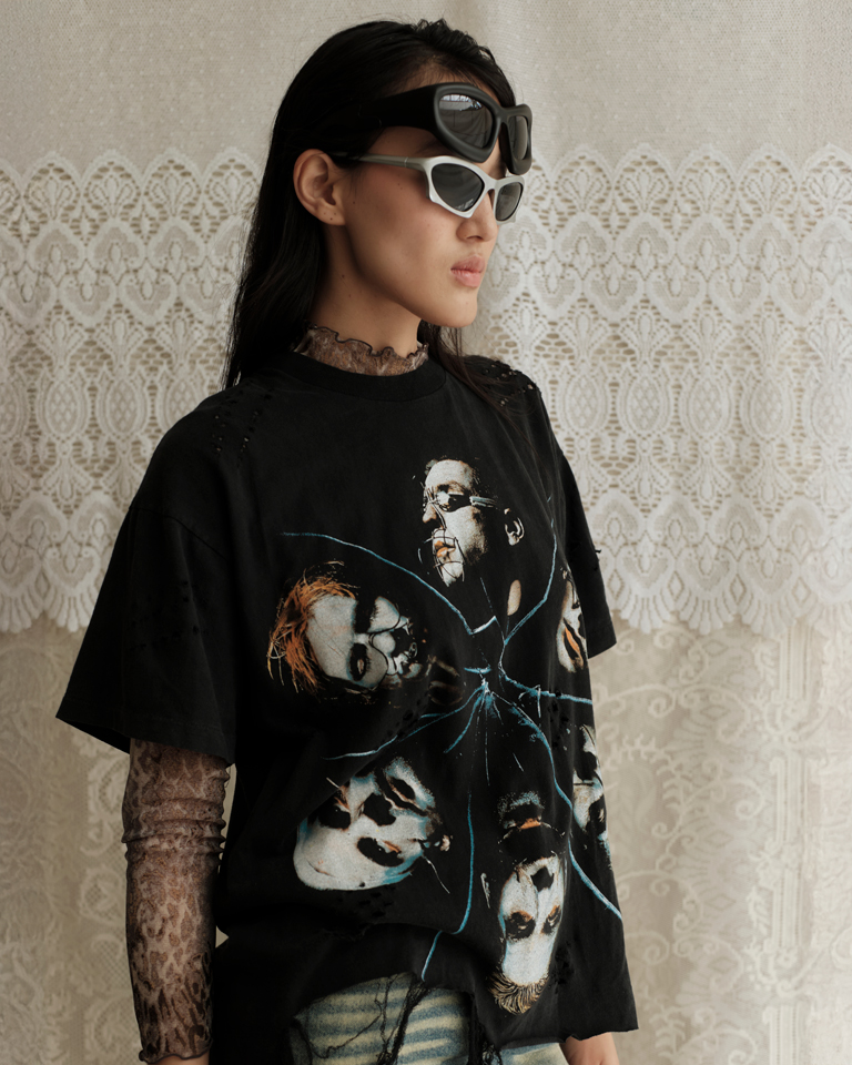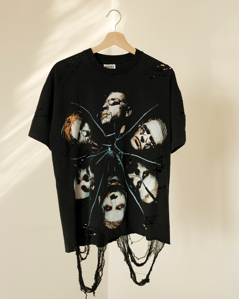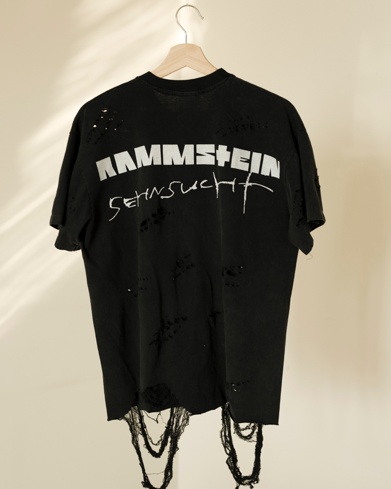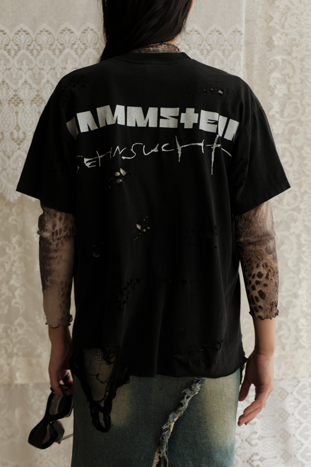A grunge-infused, upcycled Rammstein tee — distressed, raw, and unapologetically one of one.