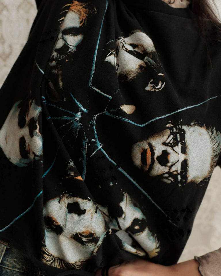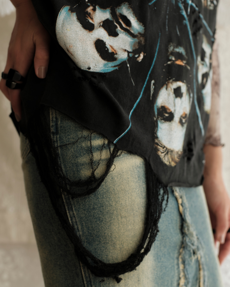 This upcycled Rammstein band tshirt boldly brings grunge to the forefront. With distressed details and raw edges, it’s crafted from a pre-loved tee and thoughtfully reimagined into a bold, one-of-a-kind piece. Loud in attitude and rich in character, this is a wearable rebellion — rooted in the past, yet made for right now.