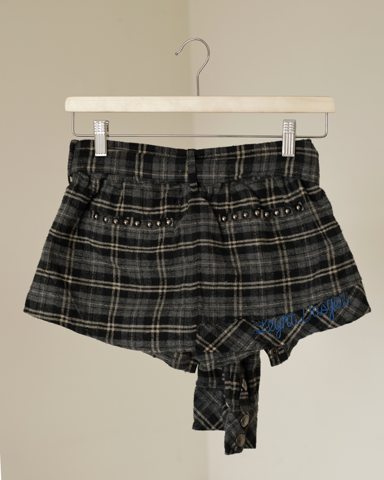 This upcycled mini skort started its life as a vintage plaid shirt — buttons, collar, etc. We gave it a second chance (and a zipper), turning it into a structured, punk-inspired piece with built-in shorts for easy movement.