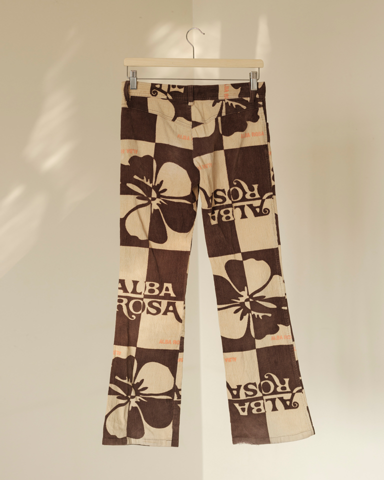 Vintage Japanese Alba Rosa floral pants — a rare retro find featuring bold hibiscus prints, checkerboard design, and standout logo detailing. One-of-one statement corduroy trousers.