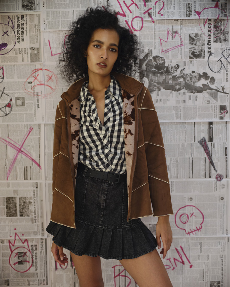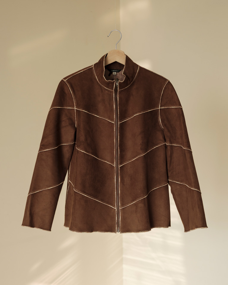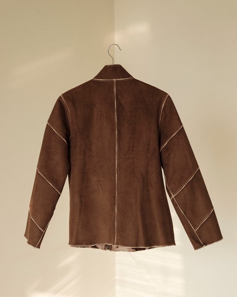 This Vintage Suede Panel Jacket is crafted from soft brown suede with contrast top-stitch detailing. The boxy silhouette, exposed seams, and shearling lining make it a versatile statement piece.